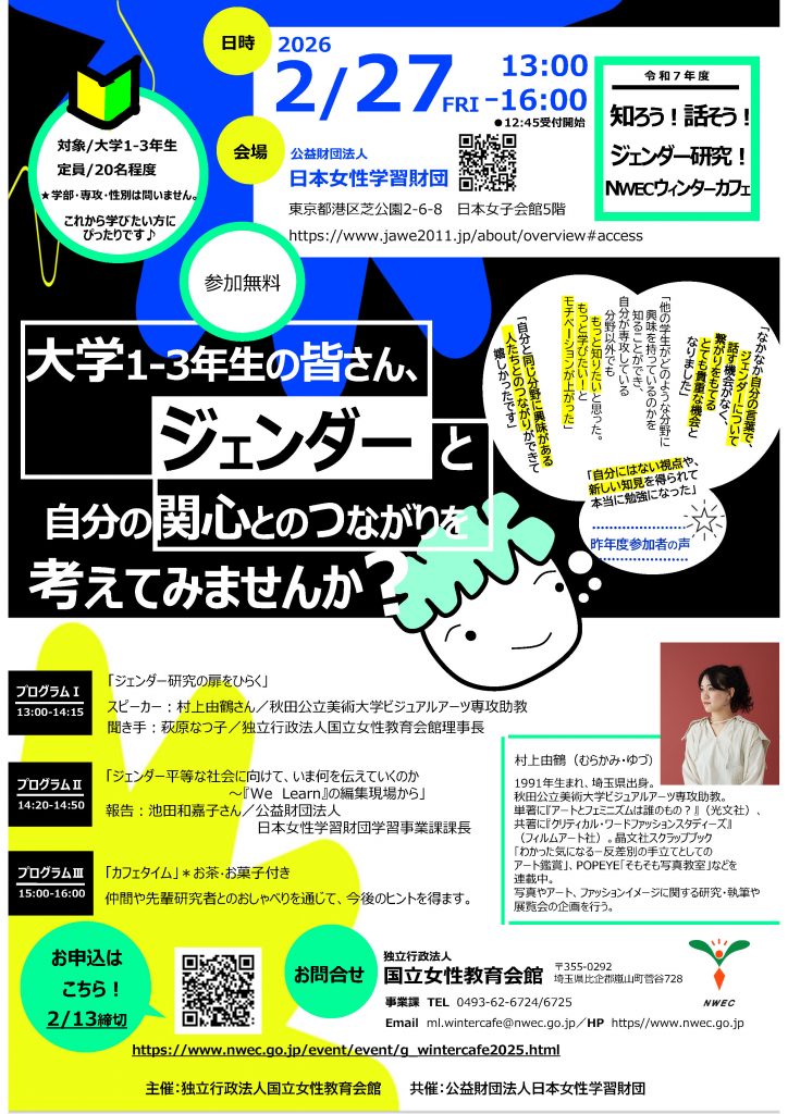 令和7年度「知ろう!話そう!ジェンダー研究!NWECウィンターカフェ」 2025年11月20日 Last updated : 2025年11月20日 三協商事 令和7年度「知ろう!話そう!ジェンダー研究!NWECウィンターカフェ」のご案内です。詳細は開催要項をご覧ください。 開催チラシ 開催要項